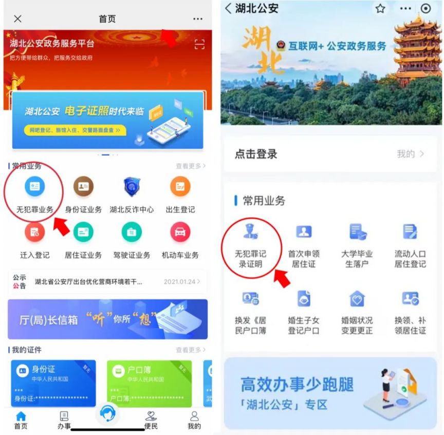 第二步:在首页点击无犯罪业务(微信),在小程序点击无犯罪记录证明(支付宝)