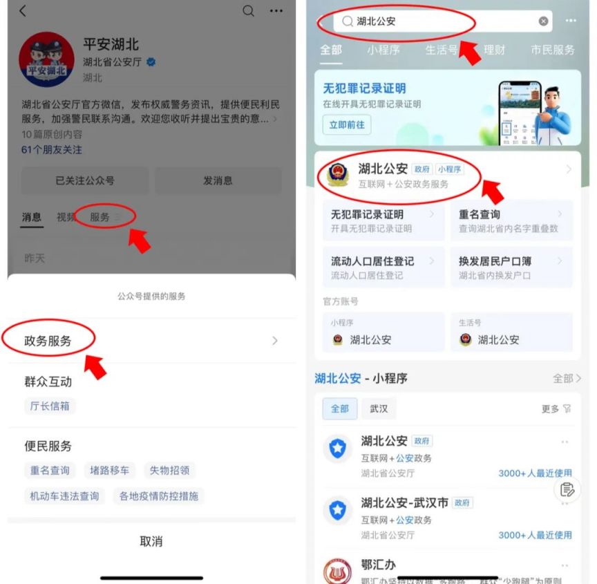 第一步:微信可通过“平安湖北”公众号点击“政务服务”进入“湖北公安政务服务平台”,或在支付宝可搜索“湖北公安”进入湖北公安小程序,办理无犯罪记录证明在线申报业务。