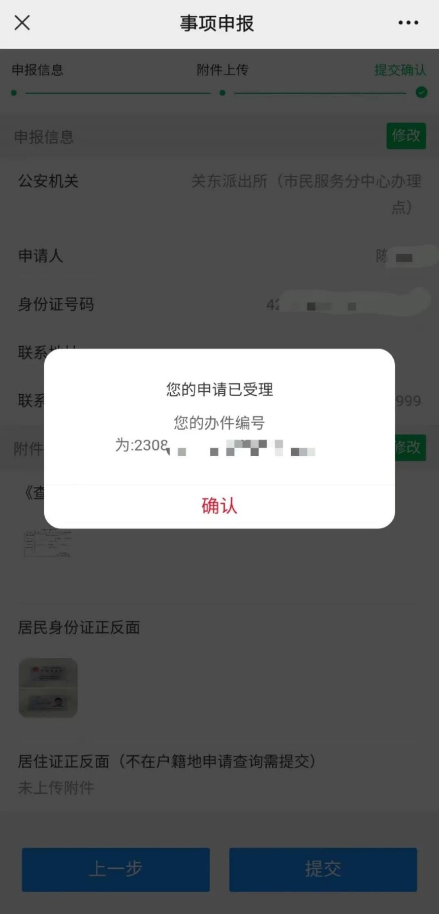 8. "等待审核": - 等待公安机关审核,审核通过后,您可以通过小程序查看证明。