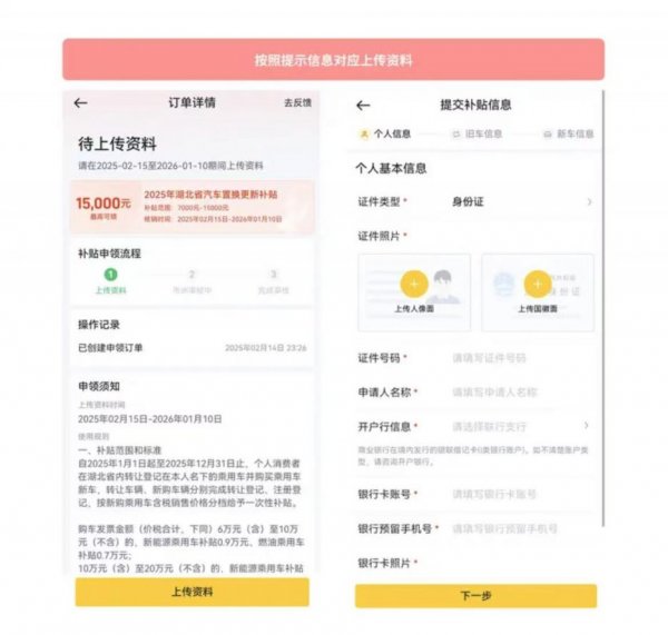 2025湖北汽车置换补贴在哪里申请? 申请入口: 懂车帝APP 申请流程: 1、下载安装并打开懂车帝APP,在首页搜索框输入并搜索“湖北省汽车置换更新”,点击进入下方活动图进入申领界面;  2、申请人点击“立即领取”后,手动输入本人真实姓名和名下可正常接收短信的手机号码,勾选“已阅读并同意《个人信息保护声明》”,点击“确认领取”,提示“领取成功”进入下一步骤。填写领取人信息时请保证信息真实有效领取手机号和核销手机号、银行卡开户行预留手机号需保持一致。  个人消费者需填报以下申领信息: 1)申请人姓名、身份证件类型和证件号码、手机号码(若选择“身份证”,需上传证件正、反面2张照片或扫描件;若选择其他证件类型,需上传证件1张照片或扫描件); 2)申请人本人持有在境内发行的银联借记卡卡号、开户行信息(须为本人名下正常可用的“|类银行账户”,请与开户银行核实账户类型); 3)旧车车辆识别代号(车架号)、号牌号码、转让登记日期等; 4)转让旧车的《二手车销售统一发票》原件照片或扫描件; 5)旧车转让后《机动车登记证书》原件照片或扫描件(包含第1页、第2页以及转让前车辆登记和本次转让登记信息等); 6)新车车辆识别代号(车架号)、号牌号码、开票日期、注册日期等; 7)购买新车的《机动车销售统一发票》原件照片或扫描件:8.新车《机动车登记证书》原件照片或扫描件(第1页、第2页); 申请人须认真核对手动填录和平台自动填录的信息,对有误信息进行更正,保证申请信息真实性、准确性。 4、完成资料上传完成后请等待审核,如果审核不通过将会有对应提示,请按照提示重新提交资料或进行修改;待审核通过后,请等待补贴下发。  举报 举报